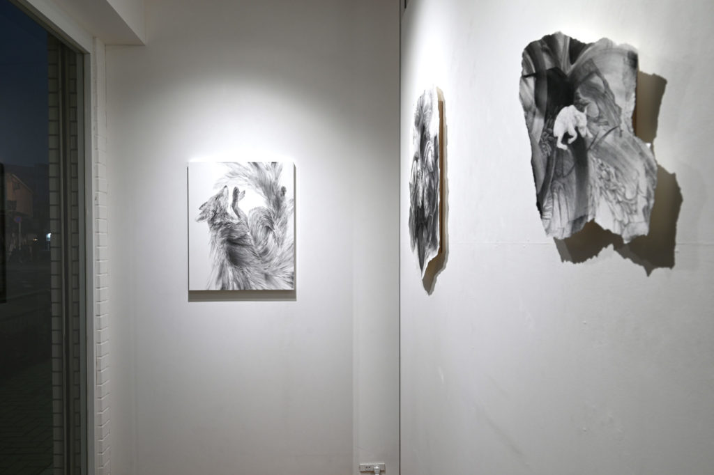 Prompted by experiences such as the death of her beloved dog, Honke continues to contemplate deeply the question, “What does it mean to be alive?” While life is undeniably singular, no being can live alone. Humans, animals, plants, and their surrounding environments are all indispensable to existence. To express this interdependence, Honke creates works in which large, flowing forms rendered in charcoal emerge, within which living beings appear as integral parts of the whole.